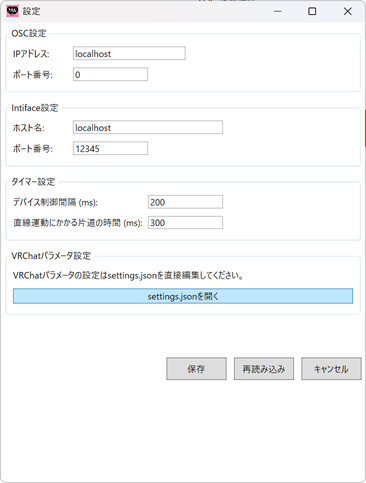 - デバイス制御間隔: デバイスの制御を行う間隔をミリ秒で指定します.数値が小さいほど細かく制御が行われますが,通信の遅延やデバイスによっては動作が不安定になる場合があります.